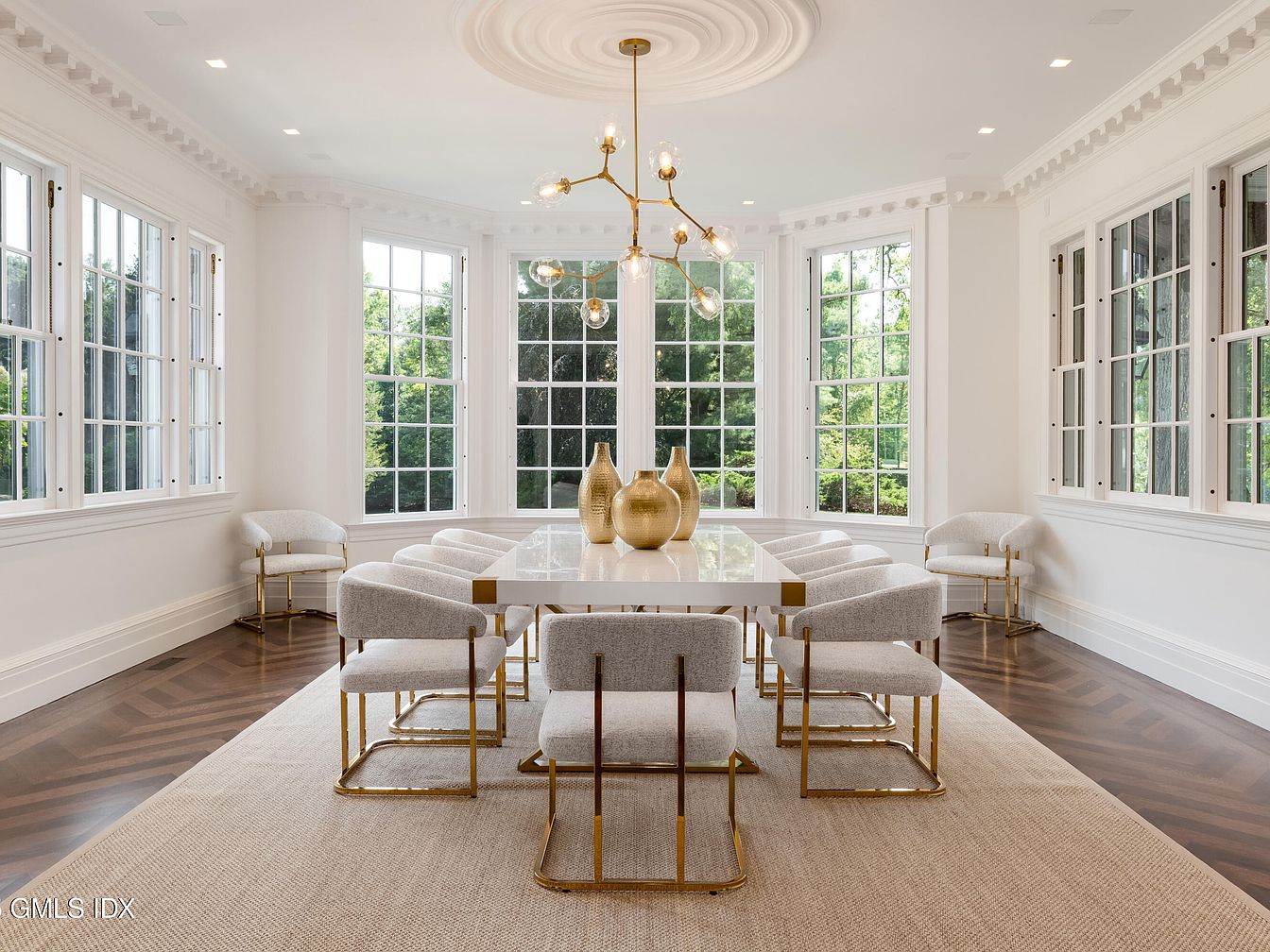 A spacious dining room filled with natural light from large, white-trimmed windows that wrap around the corner of the room, offering lush views of the greenery outside. The centerpiece is a sleek rectangular dining table surrounded by luxurious upholstered chairs with gold legs, providing comfortable seating for eight. The polished wood herringbone floor contrasts beautifully with a neutral area rug, making the space inviting for family gatherings. Architectural details include intricate crown molding and a statement gold modern chandelier. The soft, neutral color palette with gold accents creates a warm, open, and welcoming environment ideal for all ages.