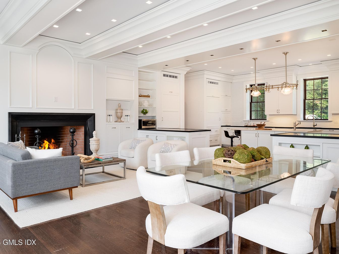 A spacious, open-concept living area seamlessly combines a modern kitchen, cozy fireplace seating, and a bright dining space, perfect for family gatherings. The room features rich dark wood floors contrasting with crisp white cabinetry, coffered ceilings, and elegant trim details that create a clean, inviting atmosphere. A soft grey sofa and two rounded armchairs surround a glass coffee table in front of the fireplace, while a large glass dining table with comfortable upholstered chairs provides plenty of room for meals or homework. Large windows fill the space with natural light, and practical kitchen islands make for easy cooking and entertaining, all enhancing family comfort.