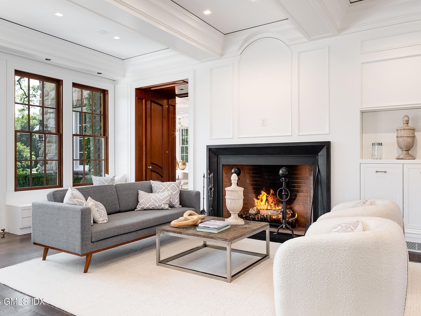 This welcoming living room features a prominent black-trimmed fireplace as its focal point, surrounded by crisp white panel molding and built-in shelving for a classic, airy feel. The room is designed for family gatherings, with a spacious gray mid-century modern sofa, two plush white armchairs, and a sturdy rectangular coffee table, all arranged atop a soft, neutral rug. Warm wooden window frames contrast beautifully with the white walls, letting in abundant natural light. The space seamlessly blends comfort and style, creating a cozy atmosphere perfect for relaxation, conversation, and warmth, making it ideal for families of all sizes.
