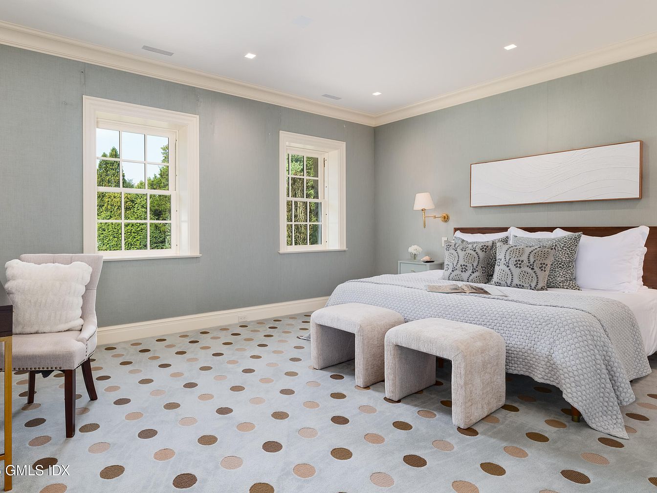 Spacious and serene bedroom with two large windows that flood the room with natural light, offering inviting views of lush greenery. The bed is generously sized and features textured bedding in soft gray tones, accented by geometric-patterned pillows for added visual interest. Two plush, upholstered ottomans sit at the foot of the bed, ideal for family seating or children. The carpet features playful polka dots in neutral browns and taupes, enhancing the family-friendly atmosphere. Neutral blue walls, classic white trim, and a light, abstract art piece above the bed contribute to the calming and contemporary aesthetic, making it perfect for everyone.