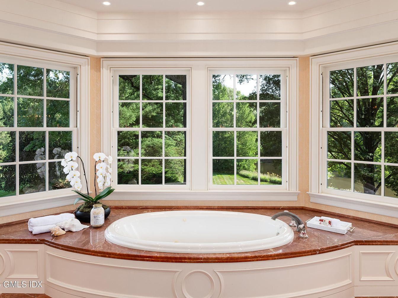 A spacious soaking tub is nestled within a cozy, light-filled bathroom alcove, surrounded on three sides by large, multi-pane windows that offer an expansive view of a lush green garden. The tub sits atop a polished, reddish-brown marble countertop with elegant molding details beneath. Bright white trim frames the windows, enhancing the clean and classic aesthetic of the space. Decorative touches such as a potted orchid, neatly folded towels, and bath accessories evoke a spa-like ambiance. This serene setting is ideal for relaxing and provides a family-friendly retreat with calming natural views and spacious surroundings.