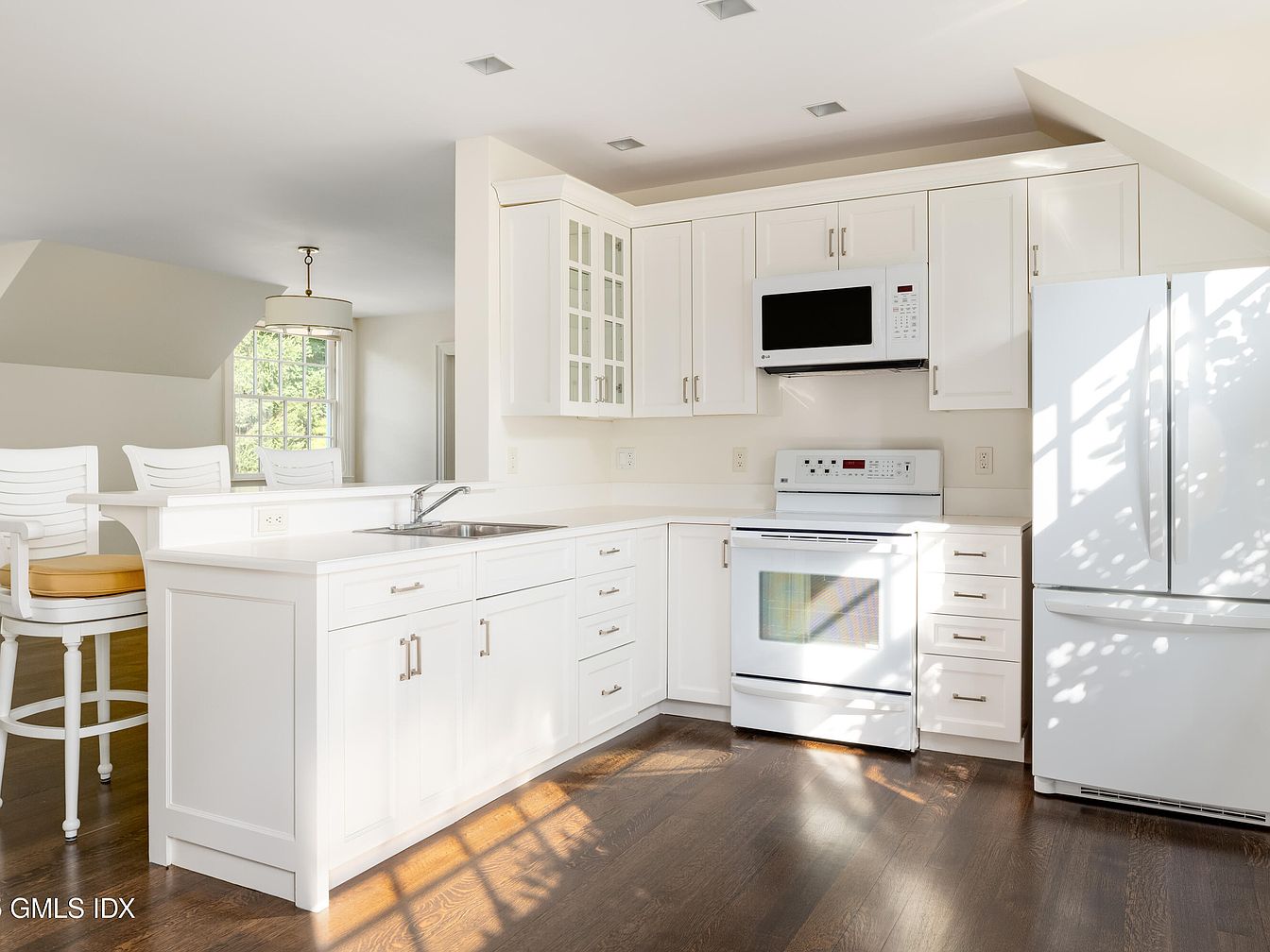 A bright and airy kitchen features an L-shaped counter with sleek white cabinetry, stainless steel hardware, and a white solid-surface countertop. Modern appliances, including a built-in microwave, electric stove, and French door refrigerator, contribute to a streamlined look. The kitchen is designed for family functionality with ample drawer and cabinet storage, easy-to-clean surfaces, and a large stainless steel sink. The open layout connects to a breakfast bar with high white chairs and soft yellow cushions, perfect for family gatherings or kids’ homework time. Natural light pours in from nearby windows, highlighting the warm, dark wood flooring and soft cream walls for a welcoming atmosphere.