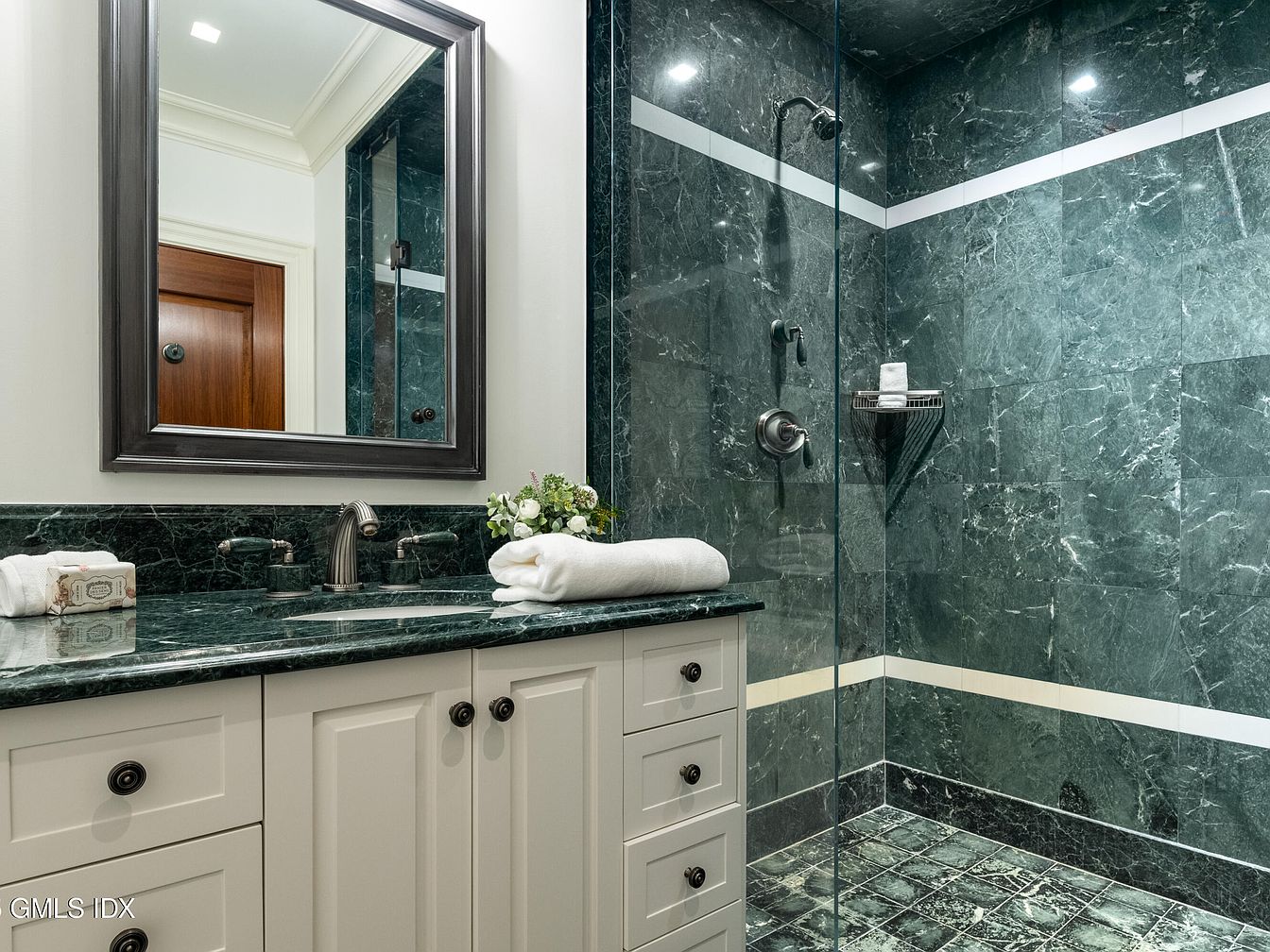 This elegant bathroom features a spacious vanity area with cream-colored cabinetry and dark, polished marble countertops. The vanity includes a large, framed mirror above the sink, stylish metallic faucets, and floral accents for a welcoming touch. Adjacent to the vanity is a glass-enclosed shower accented by striking green marble tiles, offering a luxurious, spa-like atmosphere. The shower is equipped with a sturdy metal shelf for toiletries and a rainfall showerhead. Soft lighting, clean lines, and durable surfaces make this space both practical and family friendly, while the calming green and white color scheme creates a tranquil setting for daily routines.