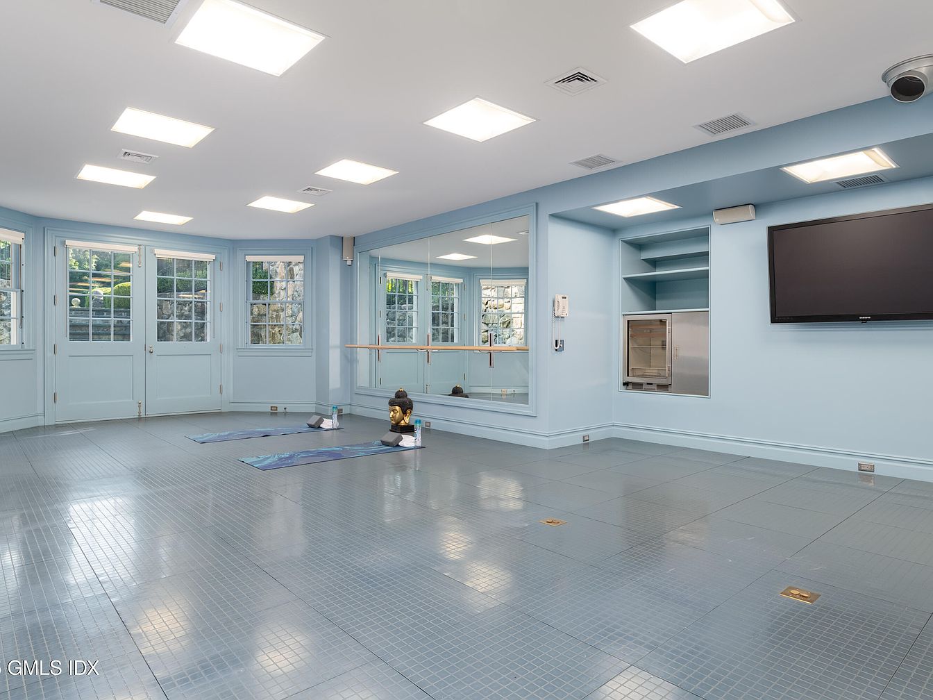 Spacious, light-filled home gym featuring large windows along one wall that allow plenty of natural daylight to brighten the room. The space is painted in a soothing, pale blue color that creates a calm, welcoming atmosphere ideal for family workouts or yoga sessions. Two yoga mats and a small decorative statue accent the tiled floor, while a wall-to-wall mirror with a ballet barre offers a functional touch for exercise routines and stretching. Built-in shelving, a mounted flat-screen TV, and practical storage space add convenience. The open layout and soft lighting make this room suitable for all ages, encouraging an active lifestyle together.
