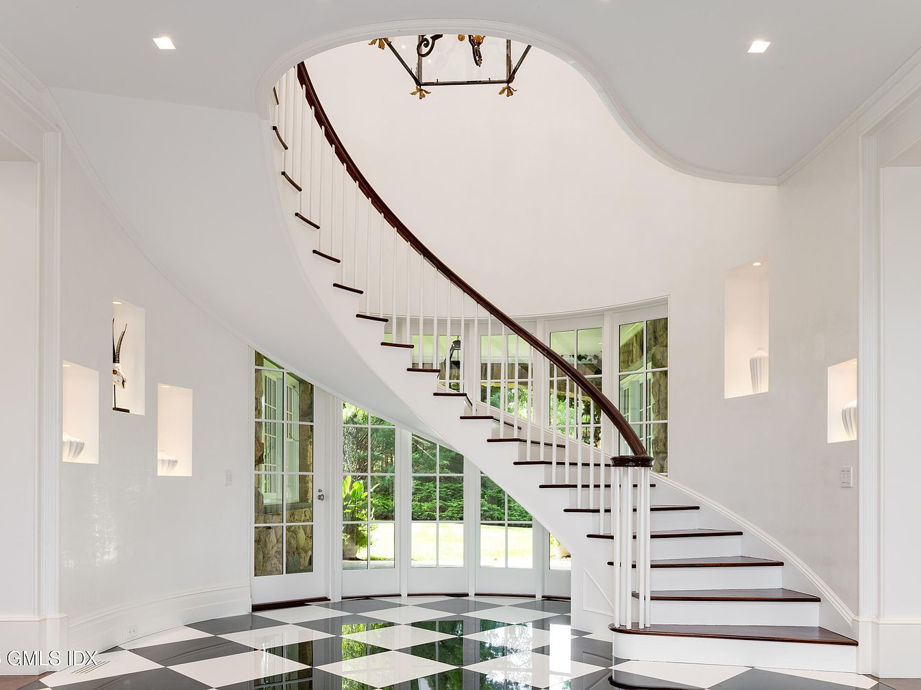 Step into a bright and spacious entryway featuring a sweeping, curved staircase with dark wood steps and crisp white risers, creating an inviting focal point for any family home. The high ceilings and large paned windows fill the space with natural light while offering clear views of the green outdoors, perfect for keeping an eye on children playing. The floor is laid with striking black and white checkered tiles that add a touch of sophistication and playful charm. Recessed wall niches display decorative vases and art, ensuring the entry is both stylish and family-friendly, with open sightlines and minimal clutter.