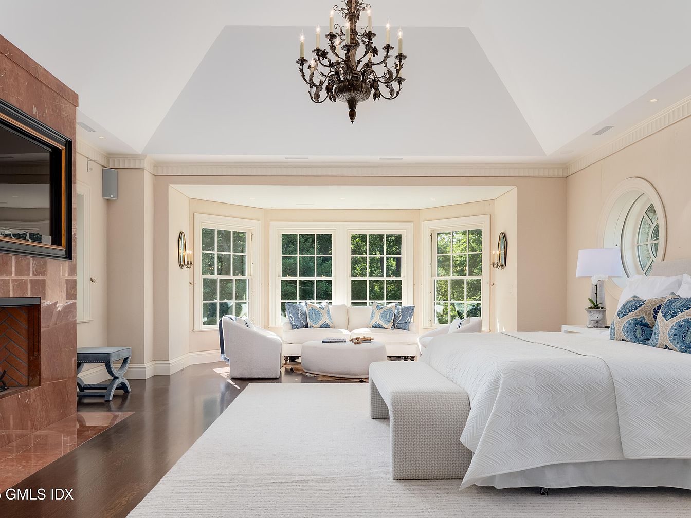 Spacious master bedroom with vaulted ceilings, exuding a sense of tranquility and openness. Natural light streams through an extended bay window seating area perfect for family lounging or reading together. Warm beige walls and a crisp white ceiling create a serene backdrop, accented by dark hardwood floors for a sophisticated contrast. The plush upholstered bed with patterned blue and white pillows, matching bench, and cozy armchairs add comfort and elegance. An ornate chandelier draws the eye upward, enhancing the room’s gracious feel. Architectural features like the round window, marble fireplace, and detailed molding provide timeless appeal for families seeking both luxury and comfort.