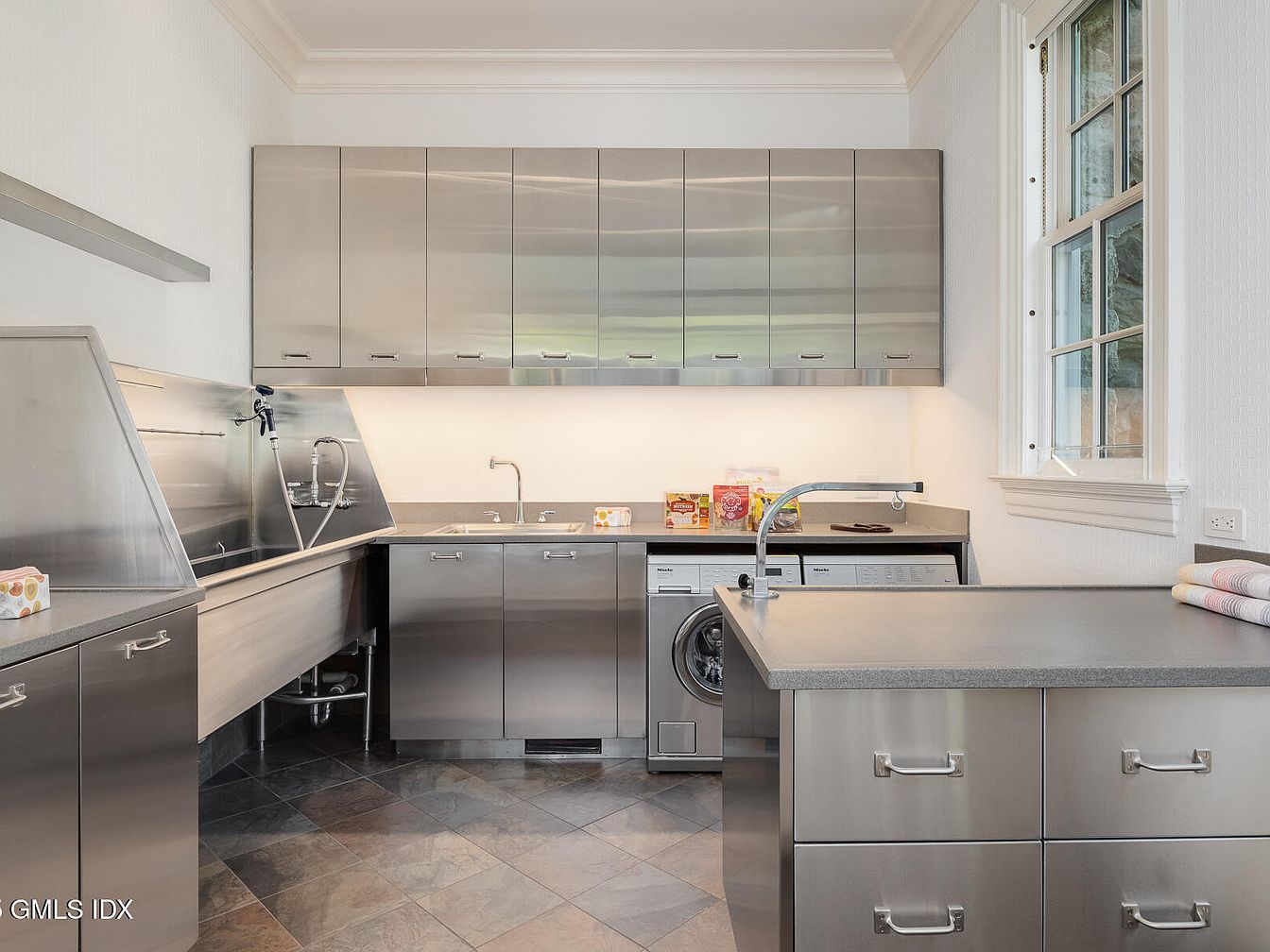 Bright, modern laundry room featuring sleek stainless steel cabinetry and countertops, perfect for busy families. The space includes ample upper and lower cabinets providing generous storage for cleaning supplies and laundry essentials. A deep, industrial-style sink and sprayer are ideal for tackling tough stains or hand-washing delicate items. Below the counter, there is a built-in washer and dryer, making laundry tasks efficient and convenient. Natural light fills the space through a large window, creating a cheerful, functional environment. The neutral palette, clean lines, and tiled floor are easy to maintain, echoing a sense of order and practicality for daily household needs.