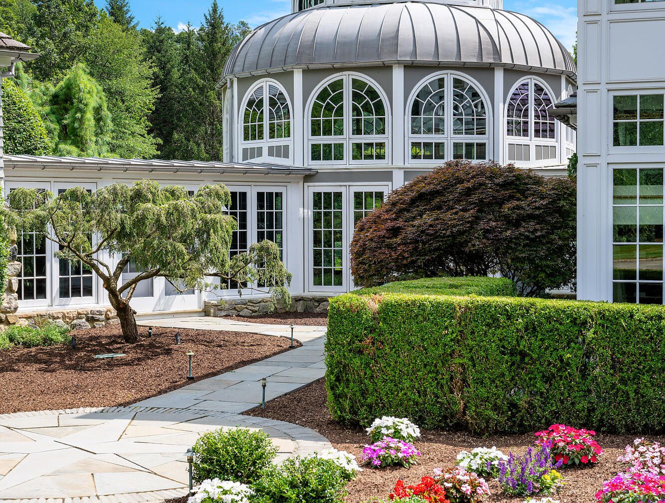 A beautifully landscaped garden walkway leads to the home’s stunning sunroom, which features large arched windows arranged in a curved pattern under a domed roof. The neat stone pathway is bordered by manicured hedges and colorful flower beds filled with vibrant reds, purples, and whites that create a welcoming atmosphere for families. Mature shrubbery and uniquely shaped small trees add lushness and visual interest, while the ample glass windows provide abundant natural light and connect the garden to the indoors. The overall setting is peaceful, safe, and ideal for children to explore or for outdoor family gatherings.