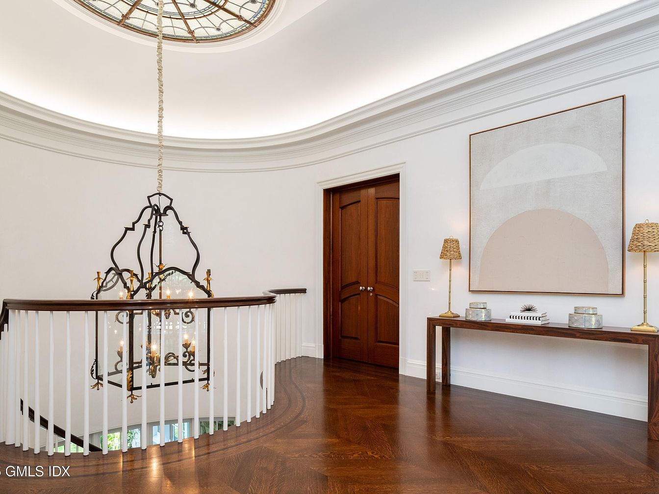 This spacious upstairs landing exudes elegance and warmth with a sweeping wood and white banister that curves around a dramatic staircase. The richly stained hardwood floor is complemented by crisp white walls and intricate crown molding that adds a touch of sophistication. A grand chandelier hangs through a stained glass dome skylight, bathing the area in natural light. The double wooden doors offer privacy and a sense of tradition. A contemporary console table, adorned with decorative lamps and modern art on the wall, provides a welcoming and functional space, perfect for families who need a safe, open area for gathering or passing through between rooms.
