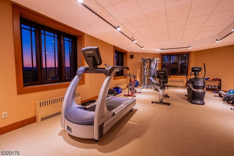 Spacious home gym designed for the whole family, featuring large, dark-framed windows that let in plenty of evening light and offer serene outdoor views. The room is finished in warm tan tones with soft, low-pile carpeting that makes it comfortable and safe for all ages. Modern fitness equipment, including a treadmill, stationary bike, and multi-station weight machine, are thoughtfully arranged for easy movement and access. The neutral color palette, ample lighting from sleek ceiling fixtures, and uncluttered layout create a welcoming atmosphere that encourages healthy routines. This dedicated space supports an active, family-friendly lifestyle in a calming environment.