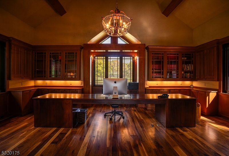 A spacious home office featuring rich wood paneling and custom cabinetry that lines the walls, offering ample storage for books, files, or craft materials. The floor is adorned with polished hardwood, creating a warm and inviting atmosphere. A large executive desk sits at the center, facing a wall of windows with wood blinds that allow natural sunlight to pour in, making the space bright and energy-efficient. Overhead, a statement chandelier hangs from a lofty, vaulted ceiling with wooden beams, contributing to an elegant yet cozy ambiance suitable for productive family activities or quiet study sessions.
