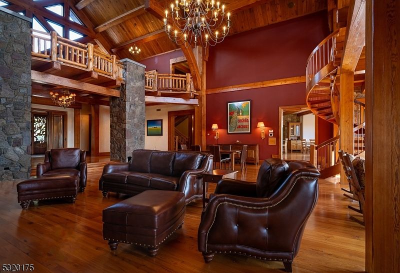 Spacious great room with vaulted ceilings, exposed timber beams, and a rustic yet elegant atmosphere. Large stone pillars and handcrafted wooden railings frame the open balcony above. Rich burgundy walls and abundant natural wood create a warm, inviting ambiance. The seating area features a set of deep brown leather sofas and armchairs arranged around a central ottoman, perfect for family gatherings. Chandeliers add soft, ambient lighting while a dramatic spiral staircase leads to the upper level, encouraging family interaction and easy supervision. The layout is open and welcoming, with ample space for children to play and adults to relax together.