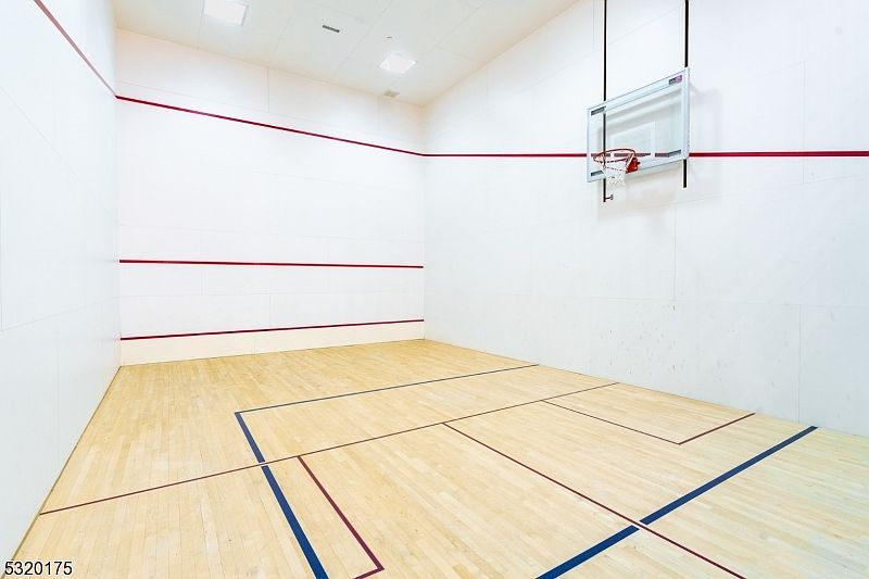A spacious indoor recreational court features flawless light wood flooring accented with bright blue and red boundary lines, offering a versatile space for both racquet sports and basketball. High white walls with crisp red play lines maximize visibility and reflect natural and overhead light, creating an energizing atmosphere. A clear basketball hoop is mounted securely on the far wall. Ample overhead lighting ensures consistent brightness, making the room ideal for active family fun or friendly games. The minimalist, bright aesthetic promotes safety and clean lines, encouraging healthy play and social bonding for children and adults alike.