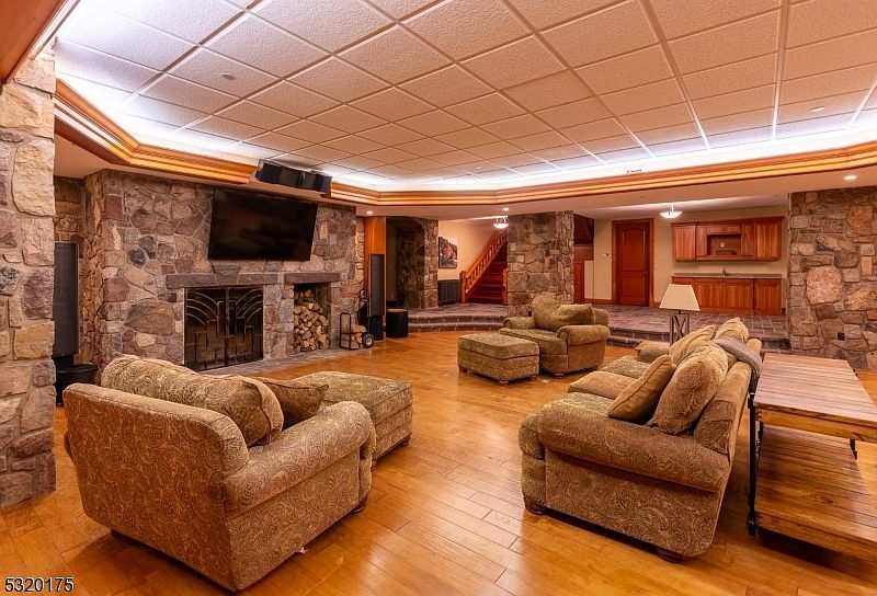 Spacious basement lounge with a warm, inviting ambiance perfect for family gatherings. The room features rich hardwood floors and is anchored by a rustic stone wall with a large fireplace, topped by a mounted flat-screen TV. Three generously cushioned sofas and an armchair, all upholstered in earthy sage and gold patterns, create a comfortable seating arrangement. Recessed lighting and a soft, wood-trimmed drop ceiling enhance the cozy atmosphere. Stone columns frame the space, and there is a wet bar area with wood cabinetry to the back. The open layout and durable finishes make this a versatile, family-friendly entertainment area.