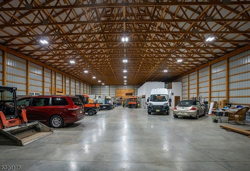 Expansive multi-vehicle garage featuring a high vaulted ceiling with exposed wooden trusses and bright overhead lighting, creating an open and airy atmosphere. The polished concrete floor and clean lines add a modern touch, while the wood-framed metal paneled walls contribute a farmhouse-inspired feel. Ample space allows for accommodating several cars, utility vehicles, and equipment, making it ideal for families with multiple drivers or hobbies. To the right, workbenches and comfortable seating offer room for projects and gatherings. The wide, uncluttered layout ensures easy movement and versatility, supporting both family activities and practical storage needs.