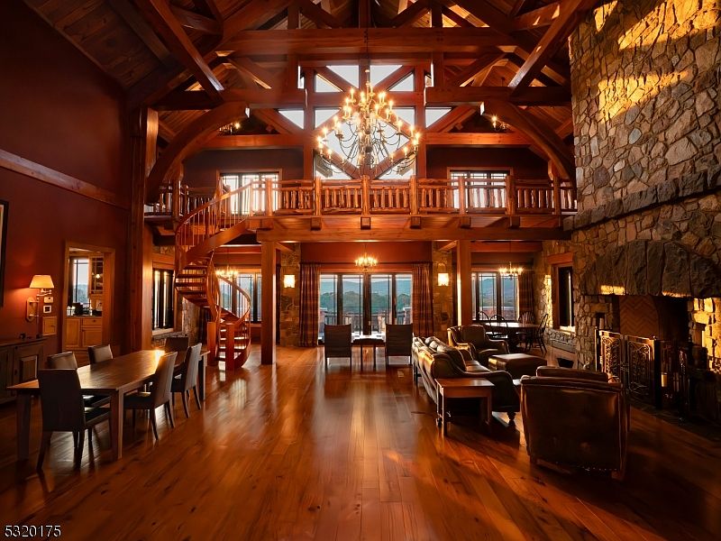 Spacious open-concept great room with soaring vaulted ceilings, exposed timber beams, and a large stone fireplace as the centerpiece. Warm wooden floors stretch across the entire room, complemented by rich earth-toned walls and natural light pouring through expansive windows. A grand chandelier hangs from the ceiling, casting a cozy glow. The area features a comfortable seating arrangement with plush sofas and armchairs, a family-sized dining table, and a spiral staircase leading to an inviting loft. Perfect for gatherings, the layout encourages togetherness with its ample space, family-friendly furniture, and seamless blend of rustic charm and elegance.