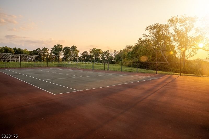 A full-sized tennis court stretches across a spacious outdoor area, bordered by a secure chain-link fence for added safety, ideal for families with children. The court is surfaced in deep red and muted green tones, clearly marked with crisp white boundary lines for play. Lush green grass surrounds the area, with mature trees offering natural privacy and scenic views. The setting sun casts a gentle golden light, creating a warm, inviting atmosphere perfect for late afternoon or evening games. The open layout provides plenty of space for recreational activities, encouraging outdoor fun and active family time.