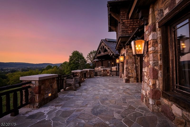 Expansive stone patio bordered by rustic wood-and-stone railings, offering a spacious outdoor living area ideal for gatherings and family relaxation. The surface features irregular cut flagstones in natural gray hues, complementing the hand-laid stone walls of the home. Warm lantern-style lighting fixtures are mounted along the house, giving a welcoming glow in the soft evening light. Several sturdy wooden benches are thoughtfully placed for seating, and the wide terrace provides unobstructed views of rolling hills and lush green forests. Architectural details include heavy wood beams, wood shake siding, and large windows, all contributing to a cozy, inviting mountain home ambiance.