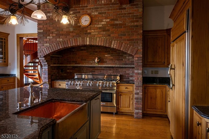 Warm and inviting, this spacious kitchen features a striking brick hearth with an arched alcove framing a professional-grade stainless steel range, creating a cozy rustic centerpiece for family gatherings. Natural wood cabinetry and trim offer plenty of storage and blend beautifully with polished black granite countertops and an island housing a distinctive copper sink. Overhead, wood beams and unique pinecone lighting fixtures add charm, while a wall clock introduces a practical touch. The rich wood flooring offers durability and is easy to clean, making it perfect for busy family life. An adjacent spiral staircase adds architectural interest and convenient access.