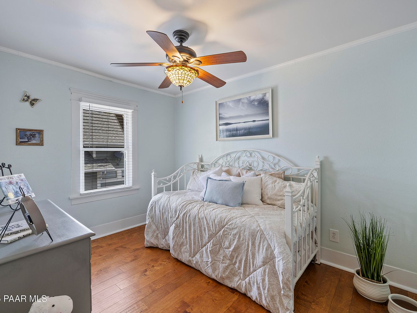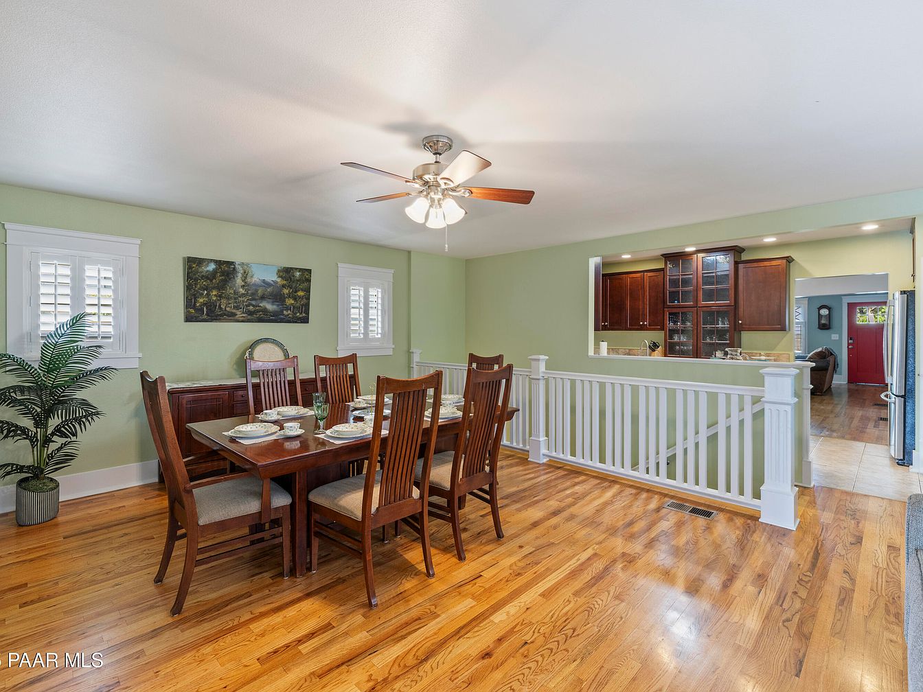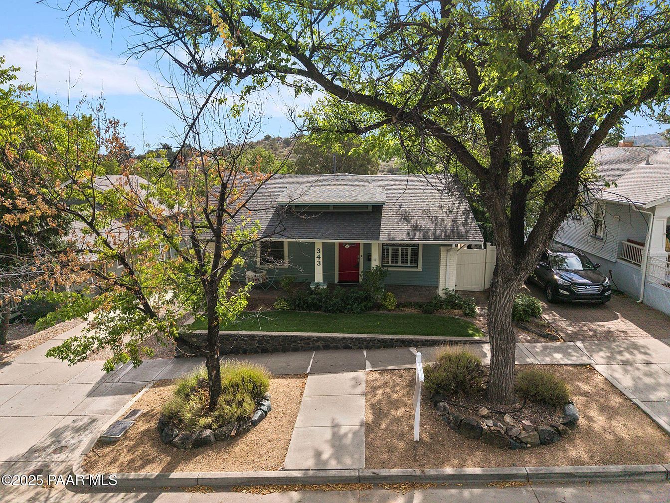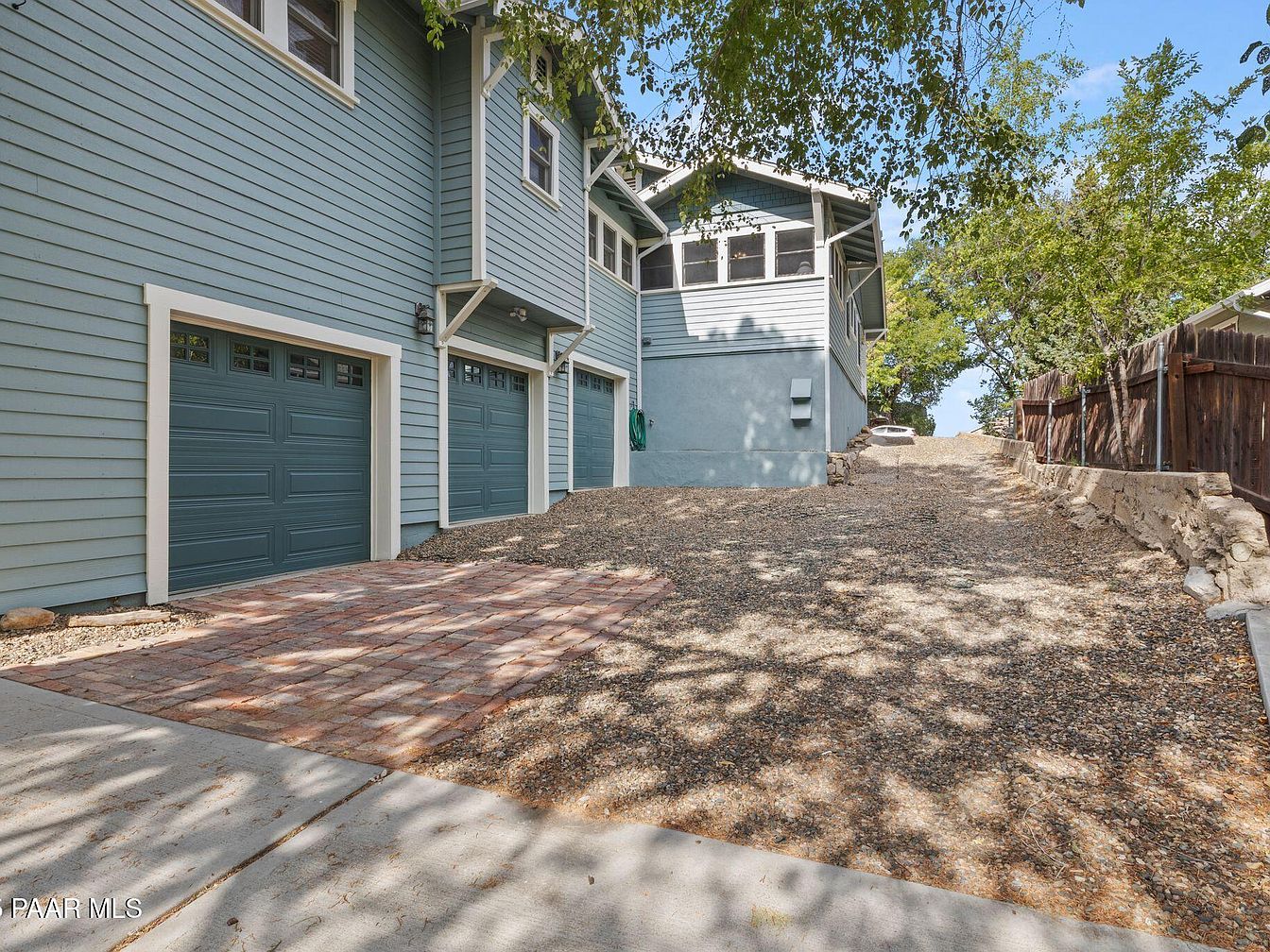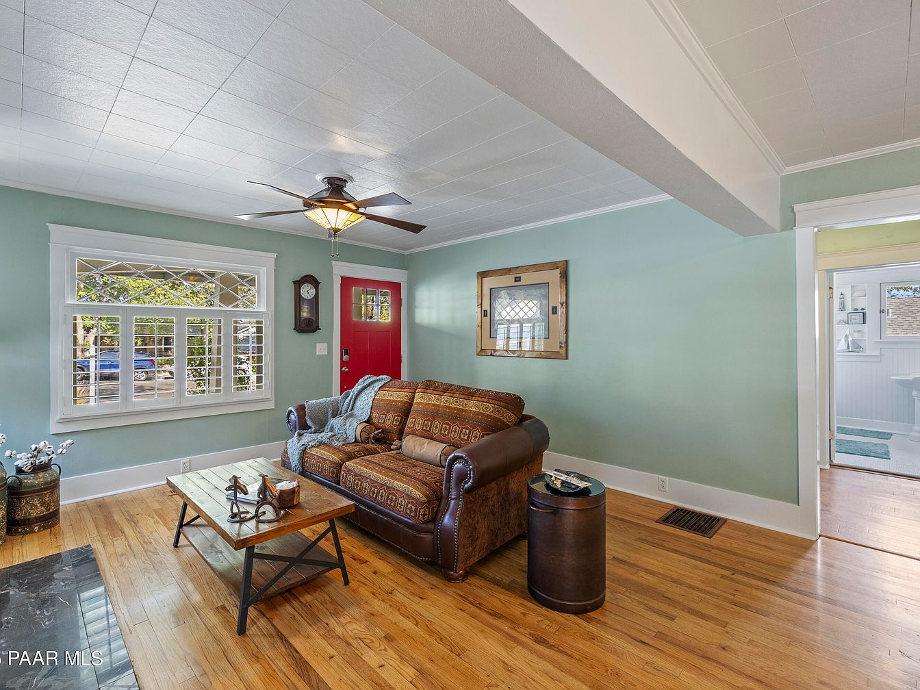 Nestled in Prescott’s Historic District, this Craftsman bungalow built in 1929 showcases historical significance melded with modern amenities. The home features classic architectural elements, including original hardwood floors, a decorative fireplace, and a striking red front door enhancing its curb appeal. Extensive renovations, including a spacious addition completed in 2006, provide modern comforts with a kitchen, family room, large laundry area, and a luxurious primary suite with a private deck. The reinforced foundation and expansive attached 3-car garage, accessible from Mt. Vernon Ave, further enhance functionality. With scenic views of Thumb Butte and a listing price of $1,180,000, this property offers a blend of historic charm and contemporary living in a picturesque location.