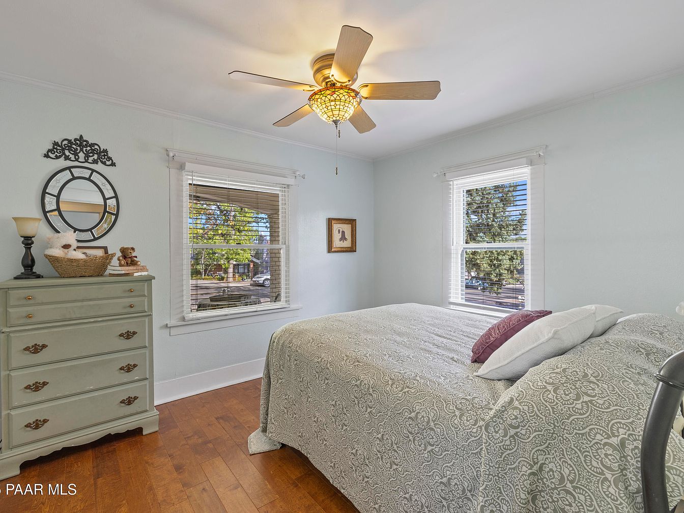 A cozy bedroom showcasing a serene atmosphere with soft blue walls that enhance natural light. A patterned bedspread adds texture to the neatly made bed, adorned with stylish throw pillows. The wooden floor adds warmth, complemented by a vintage-style dresser painted in a muted green. Natural light filters through the wooden blinds of two windows, framed by white trim. On the dresser, a decorative mirror and a basket containing plush toys create a charming focal point. A ceiling fan with a unique light fixture provides both functionality and style, completing the welcoming and tranquil aesthetic.