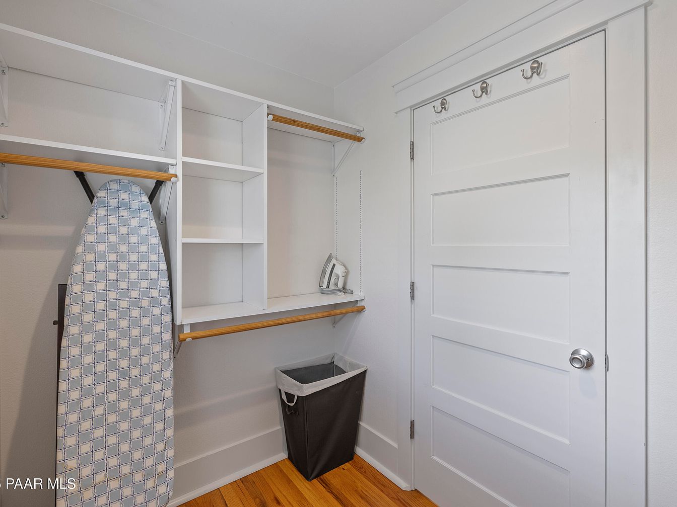 This laundry room features a clean and organized design with a bright color scheme predominantly in white. On the left, an ironing board rests against the wall, emphasizing practicality. Above, open shelving offers space for storage, while wooden rods provide function and character. A sleek iron sits atop the shelf alongside a clean, gray wastebasket, adding a modern touch. The floor showcases warm, natural wooden tones that contrast pleasingly with the white cabinetry and walls. Three hooks on the door are perfect for hanging items, enhancing the room’s utility without compromising its minimalist aesthetic.