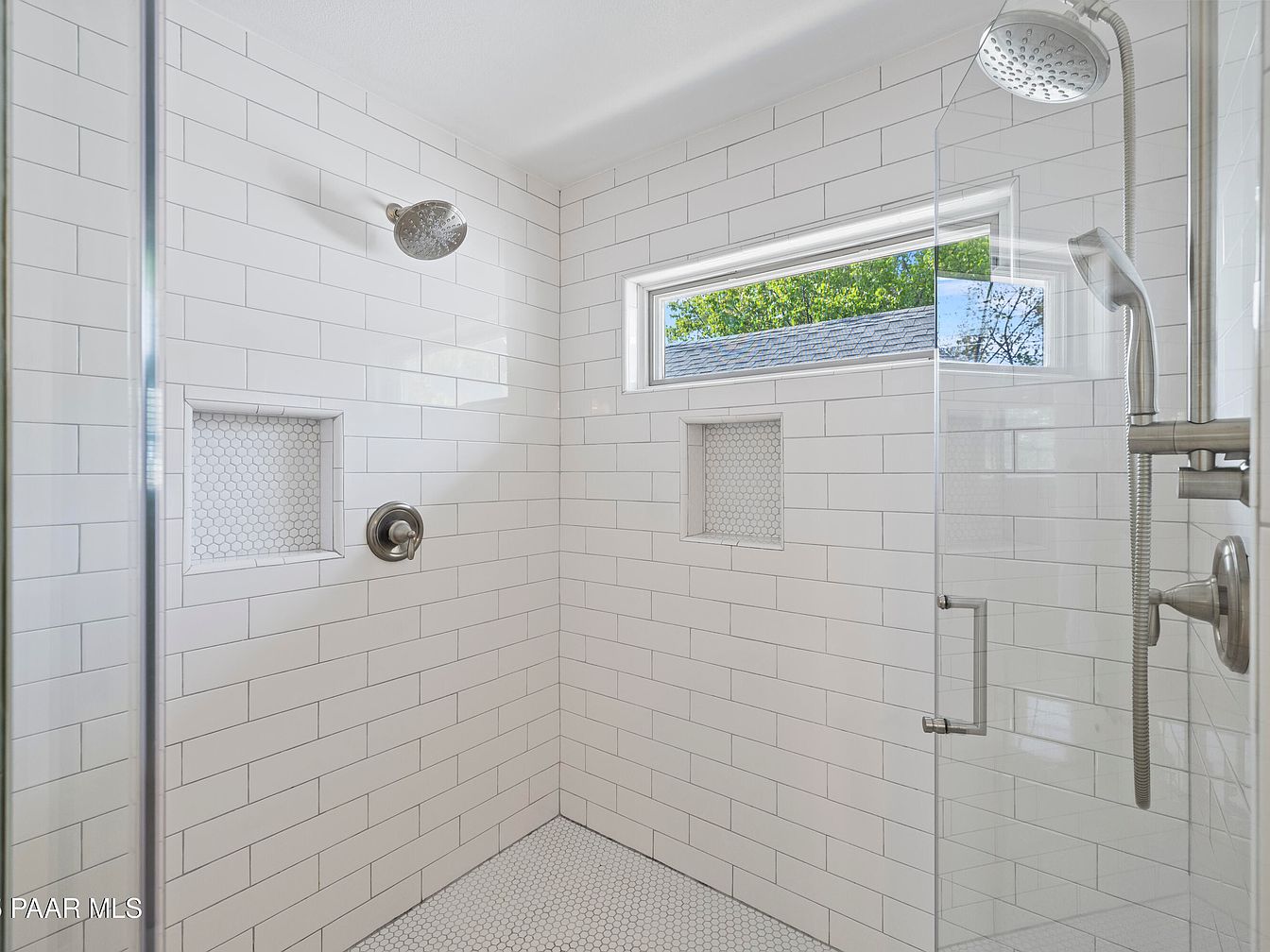 A modern shower room features a sleek and minimalist design with white subway tiles covering the walls. The large walk-in shower has a transparent glass panel and a stainless-steel showerhead mounted at an angle. Two recessed niches, one square with hexagonal tiles, provide storage for toiletries. Natural light filters through a horizontal window, casting a bright and open atmosphere. The floor is adorned with matching hexagonal tiles, enhancing the contemporary aesthetic. The overall ambiance is clean and refreshing, promoting a spa-like experience within this well-thought-out bathing area.