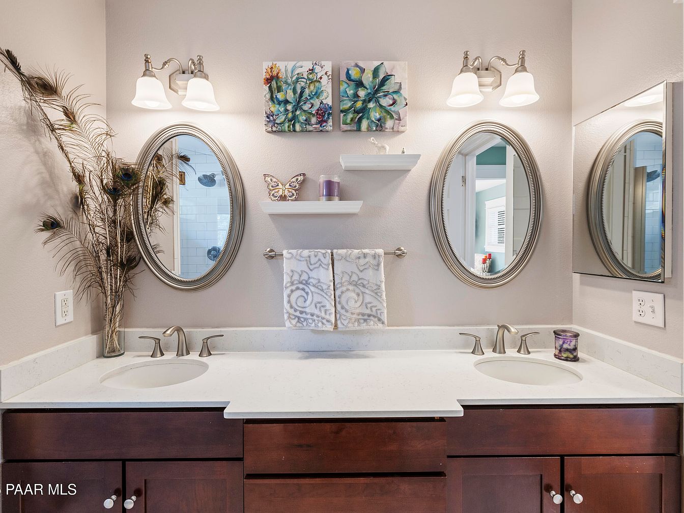 The bathroom features a stylish double vanity with a sleek white quartz countertop. Two oval mirrors reflect soft lighting from brushed nickel sconces above. Rich brown cabinetry provides ample storage, contrasting beautifully with the light countertops. Elegant decor elements include a decorative peacock feather arrangement and a butterfly art piece, adding a touch of whimsy. Plush towels hang neatly on a chrome towel bar. The walls are painted in a soft neutral tone, creating a serene atmosphere. This space is further enhanced by subtle architectural details like the unique molding around the mirrors, blending functionality with aesthetic appeal.