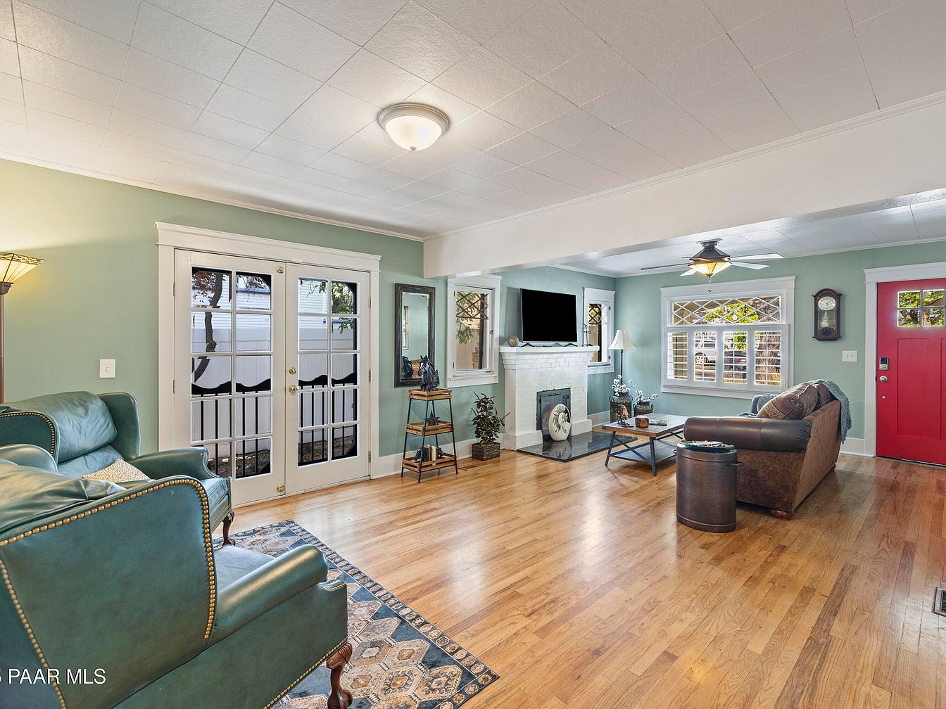 This inviting living room features a harmonious blend of vintage and modern aesthetics. A soft blue-green wall color enhances the warmth of the hardwood flooring. Two comfortable seating options include a deep blue leather armchair and a brown fabric sofa, adorned with patterned pillows. A cozy coffee table sits centrally, accompanied by a round accent table. Architectural details include tall windows with divided panes that invite natural light, while a white brick fireplace anchors the room, accented by decorative plants. Notable is the vibrant red front door that adds a touch of character to the space.