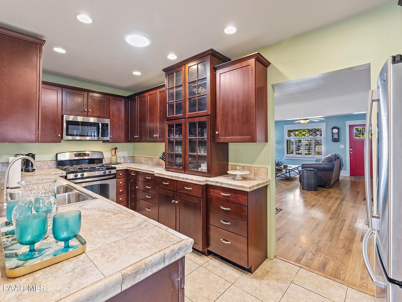 This kitchen features a blend of rich, dark wood cabinetry and granite countertops. The cabinets include both solid doors and glass-front options, showcasing decorative items. A stainless steel microwave and gas stove add a modern touch, contrasting nicely with the warm tones of the wood. Light green walls create a fresh, inviting atmosphere. An island with a sink offers additional workspace, adorned with turquoise glasses and a decorative tray. The flooring is a warm hardwood, leading to an adjacent living area highlighted by a vibrant blue wall and a bold red door, enhancing the home’s overall aesthetic.