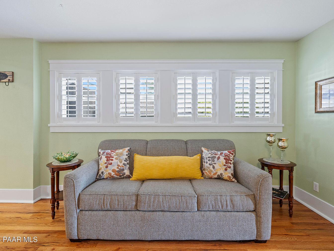 This cozy living room features a light green wall, enhancing a soothing ambiance. A plush gray sofa, adorned with colorful cushions in yellow and floral patterns, invites relaxation. Natural light pours through elegant white shutters, framed by crisp white trim, highlighting the space. A small round side table beside the couch showcases decorative elements, while a second table on the opposite side holds two elegant glass candle holders. The rich, warm hardwood floor adds depth and warmth, complementing the overall design. Simple yet refined artwork hangs on the wall, adding a touch of character without overwhelming the aesthetic.