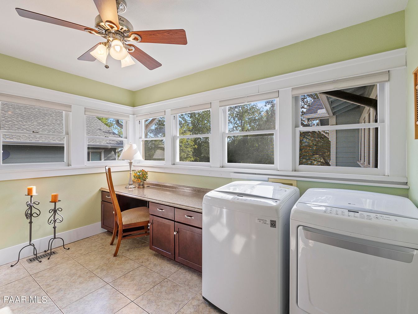 This bright and airy laundry room features a soothing light green color on the walls and ample natural light streaming in through multiple windows. A sturdy countertop extends along one wall, paired with rich wooden cabinetry providing storage beneath. An elegant light fixture hangs from the ceiling, complementing the room’s cozy atmosphere. A simple wooden chair sits at the desk space, offering a functional workspace. To the side, modern washer and dryer units provide utility, while two decorative candle holders with unlit candles add a touch of warmth and style, enhancing the room’s inviting ambiance.