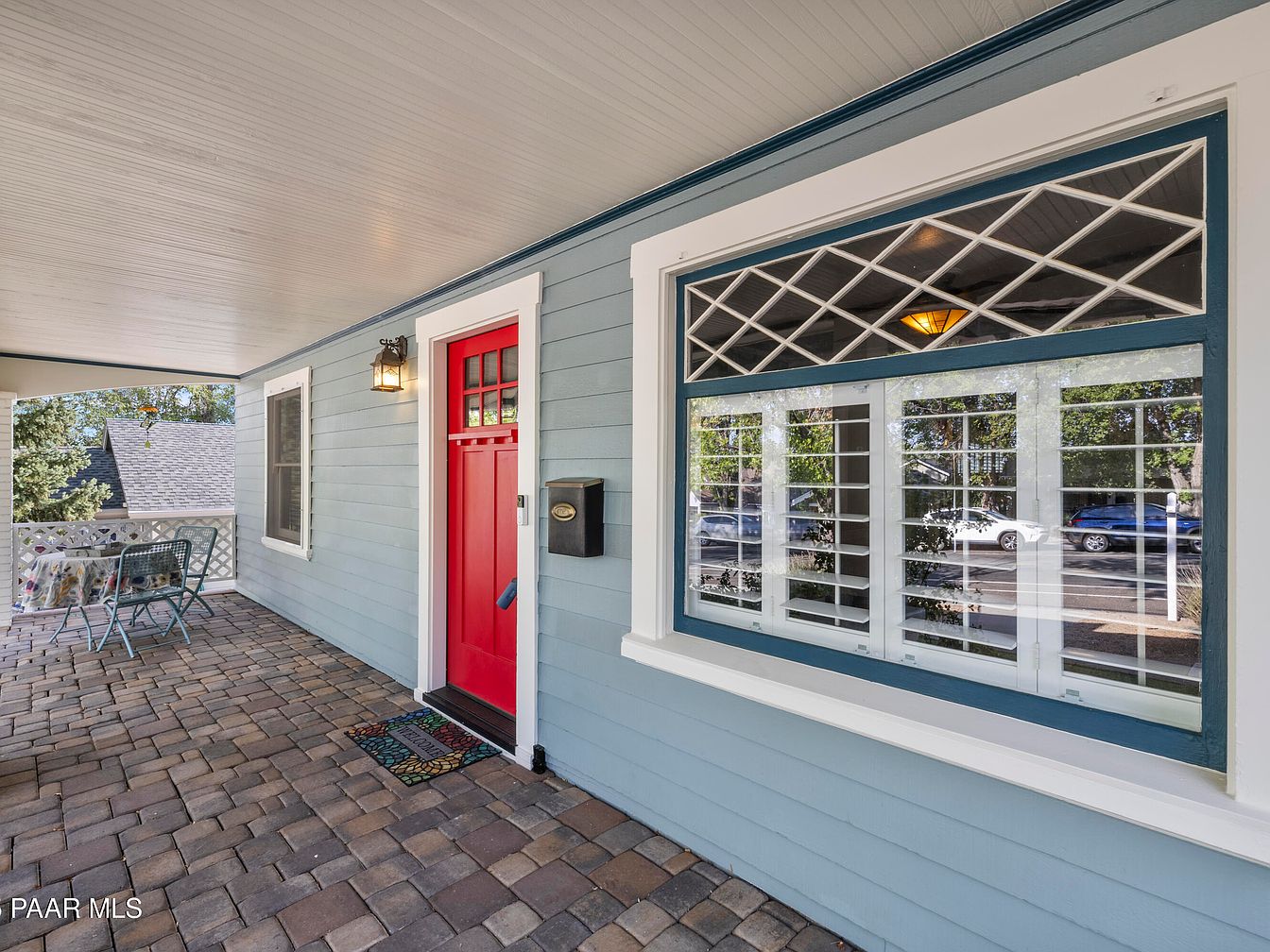 The front porch features a vibrant red door with a charming window above, accentuated by a graceful grid design. The light blue exterior walls add a refreshing feel, contrasting beautifully with the deep red entrance. Paved with intricate stone tiles, the porch offers a cozy seating area with light turquoise metal chairs and a small table, creating an inviting space for relaxation. The classic lantern fixture casts a warm glow, enhancing the welcoming atmosphere. Divided windows with plantation shutters allow natural light to filter in while maintaining privacy, perfectly complementing the overall aesthetic of this historic home.