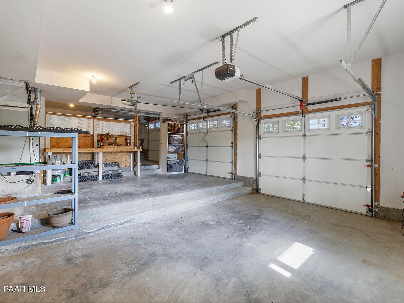 This garage showcases a spacious layout with concrete flooring and an organized storage area. The walls feature wooden beams, adding a rustic touch. On the left side, a sturdy metal shelving unit holds various tools and supplies, while a wooden workbench provides a functional workspace. Natural light filters through the windows set above the garage doors, enhancing the overall brightness. The two large garage doors are practical and framed with a simple white finish, complemented by modern garage door openers. The aesthetics emphasize utility while maintaining an orderly, uncluttered appearance, making it suitable for both vehicles and projects.