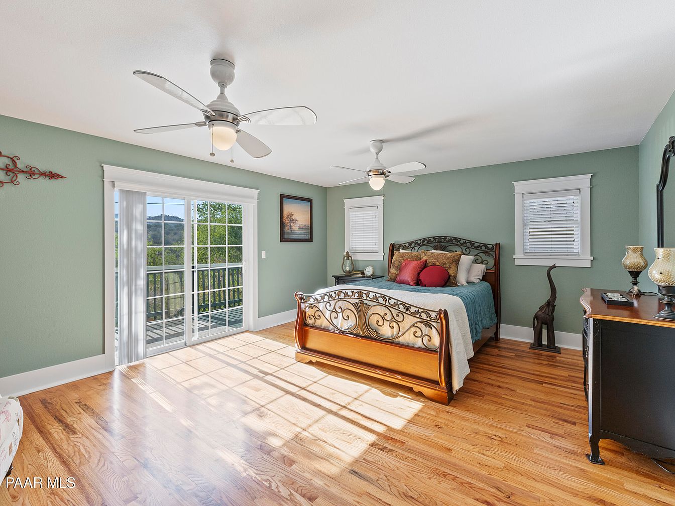 A tranquil bedroom featuring a calming green wall color accentuated by light hardwood floors. The centerpiece is a decorative metal and wood bed frame, adorned with plush pillows in rich reds and golds. A light-colored quilt completes the bedding, adding warmth. Sunlight filters through sliding glass doors leading to a balcony, casting soft shadows on the floor. Two ceiling fans add to the airy feel, while small windows provide additional light. A sleek black dresser contrasts with the warm wood tones and a tall decorative figure in the corner enhances the room’s artistic flair.