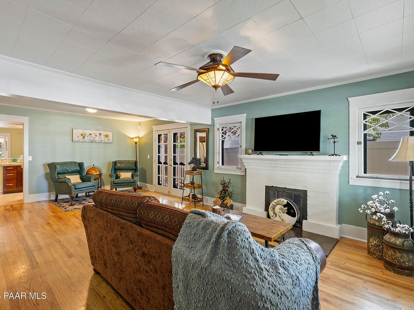 A warm and inviting living room features a soft teal wall color, complementing the rich wooden flooring. A comfortable brown sofa adorned with a textured throw invites relaxation, while a rustic wooden coffee table centers the space. Two green armchairs sit to one side, accompanied by a globe, suggesting a cozy reading nook. A sleek wall-mounted TV is above a charming white brick fireplace, which serves as a focal point. Natural light filters through decorative windows and a nearby lamp adds illumination. Decorative touches include plants and art that enhance the room’s welcoming atmosphere.