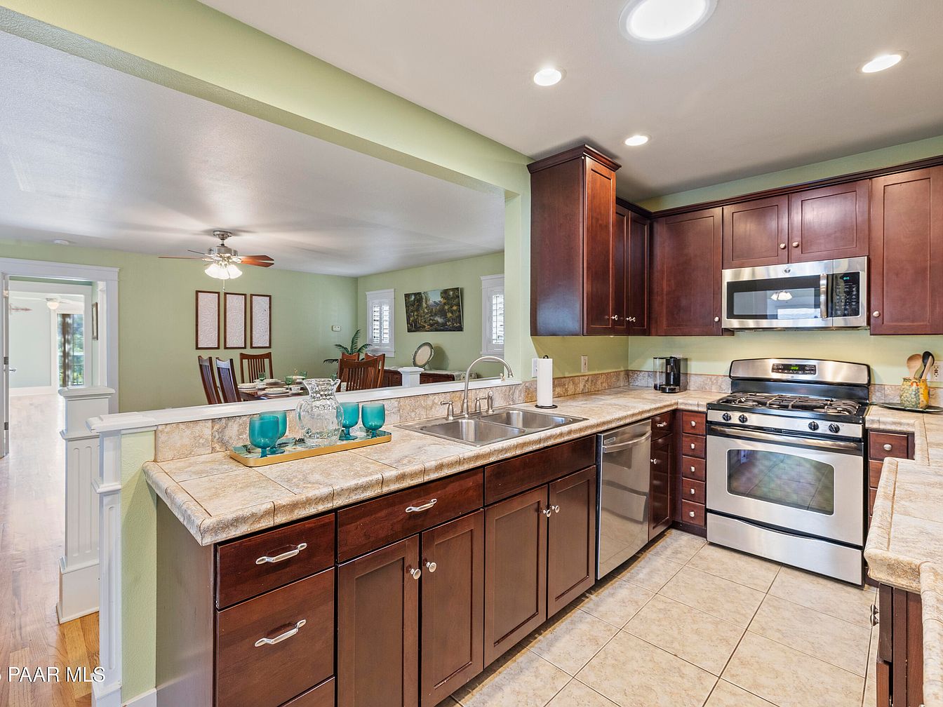 The kitchen features a modern design with a blend of traditional and contemporary elements. Dark wooden cabinets provide rich contrast against the light green walls, creating a warm and inviting atmosphere. A spacious countertop made of light-colored stone complements the cabinetry while offering ample workspace. The arrangement includes stainless steel appliances, like a gas stove and microwave, enhancing the sleek look. Under-cabinet lighting underscores functionality. In the background, the open layout seamlessly connects to the dining area, highlighted by a fan and decorative artwork on the walls, promoting a cozy, interconnected living space.