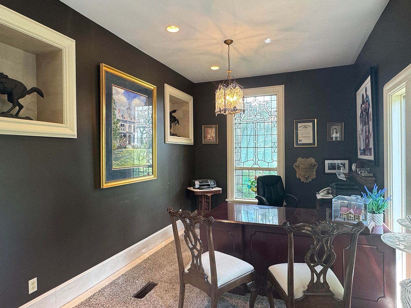 A sophisticated home office showcases a dark, rich color scheme accented with deep gray walls. Elegantly framed artwork, including paintings and a unique stained glass window, provide visual interest. A polished wooden desk dominates the space, complemented by ornate, upholstered chairs. Decorative shelves house stylish sculptures, adding a touch of personality. The room is illuminated by a chic chandelier, casting a warm glow throughout. Natural light filters through the window, enhancing the space’s inviting atmosphere. Nearby, decorative plants add life and color, creating a harmonious blend of elegance and comfort, perfect for productivity.