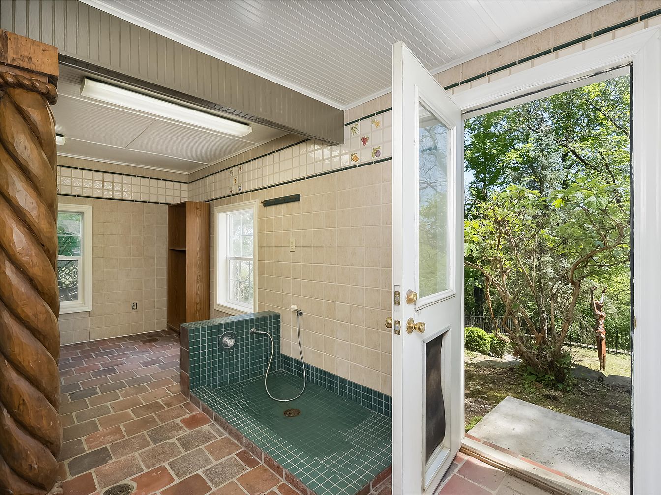 A spacious bathroom featuring a unique entrance with a carved wooden column adding an artistic touch. The walls are adorned with beige tiles and a decorative green tiled shower area. Natural light filters in through a pair of white-framed windows, highlighting the earthy tones of the terracotta-style flooring. The layout includes a built-in wooden cabinet, providing functional storage space. A clean, minimalistic design is complemented by the tiled backsplash and overhead fluorescent lighting, enhancing visibility. An open doorway reveals a glimpse of the garden outside, creating a harmonious connection between indoor and outdoor spaces.