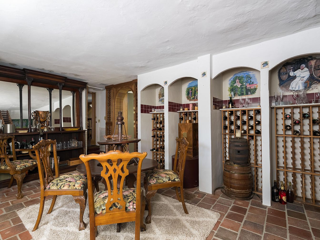 This wine cellar features a warm, rustic ambiance with terracotta tile flooring and exposed brick walls. A circular wooden table is surrounded by intricately carved chairs, adorned with floral upholstery that adds a touch of vibrancy. On one side, a rich wooden bar displays an assortment of wine bottles and crystal glasses, reflecting an inviting social space. Adjacent to the bar, wine racks neatly hold diverse bottles in wooden frames, while artistic murals above the shelves depict vineyard scenes, enhancing the room’s charm. The overall color palette embraces earthy tones, promoting a cozy, intimate environment for wine enthusiasts.