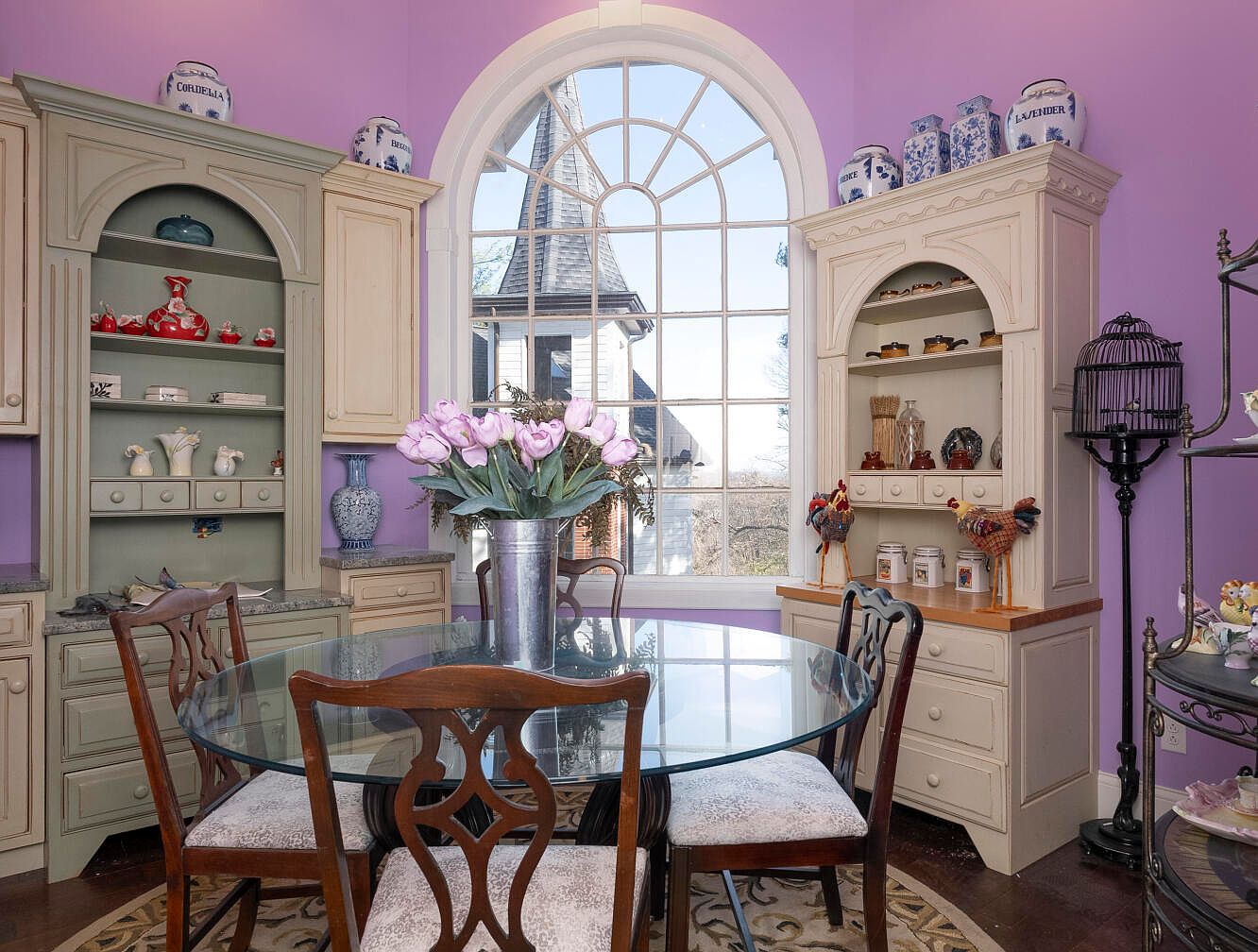 A charming dining nook features a round glass table surrounded by elegantly carved wooden chairs with soft, patterned upholstery. The walls are painted a vibrant lavender, enhancing the cozy atmosphere. Two light-colored cabinets flanking the window display decorative items and china, with a greenish hue contrasting the purple walls. A large, arched window allows ample natural light, providing a view of the outdoors. Fresh pink tulips in a metallic vase add a lively touch to the center of the table. The flooring is dark wood, accented by an intricate rug, contributing warmth and inviting character to the space.