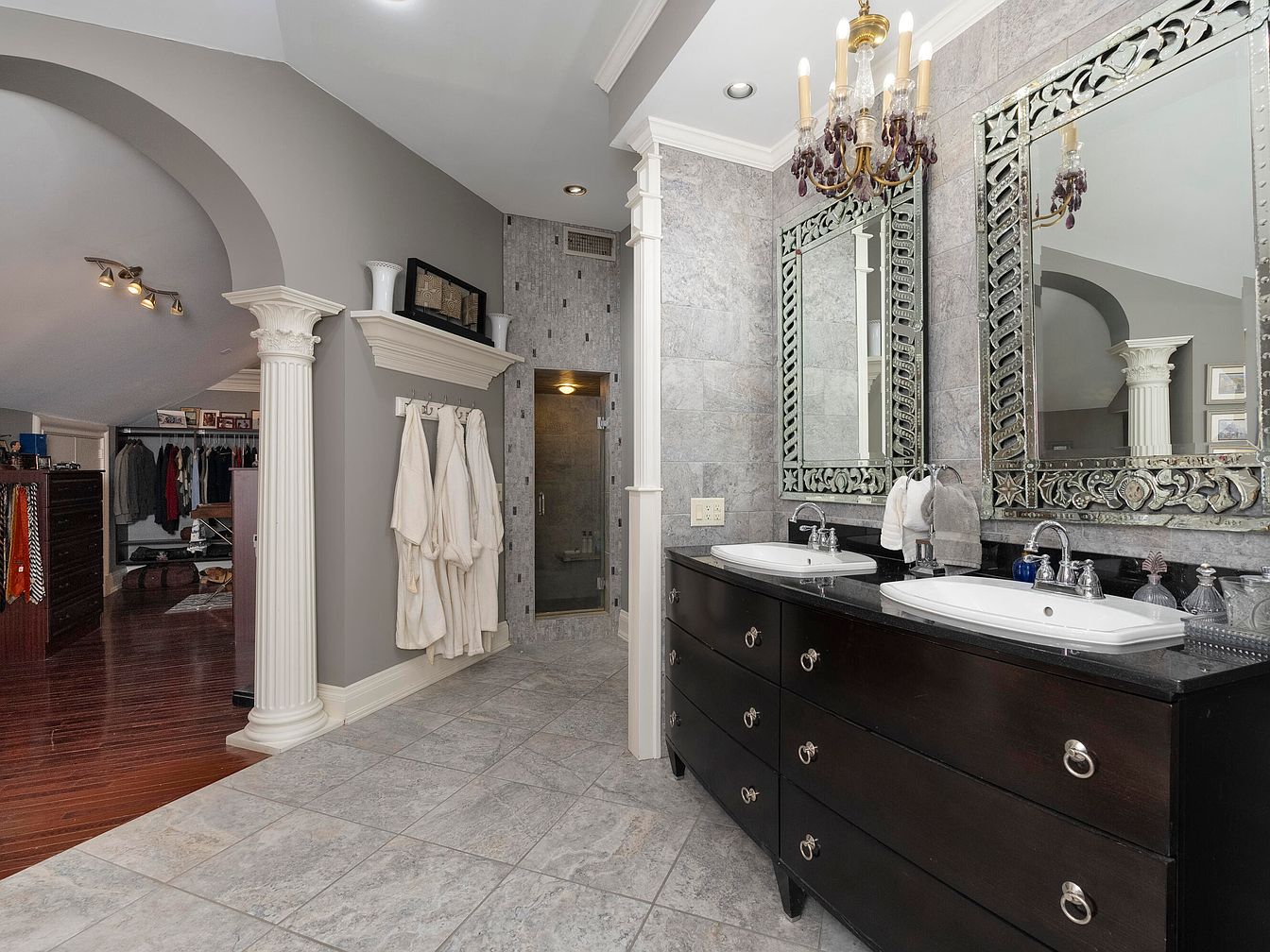 A luxurious bathroom featuring a dual vanity with sleek, dark wood cabinetry and elegant round sinks. Above the vanities, two ornate mirrors reflect the sophisticated design, framed with intricate detailing. The walls are adorned with stylish gray tiles, contributing to a modern yet classic ambiance. A graceful chandelier hangs from the ceiling, providing warm illumination. To the side, a glass-enclosed shower adds a contemporary touch, while plush white robes hang neatly on hooks, enhancing an inviting atmosphere. The distinct column adds architectural interest, defining the space between the bathroom and an adjacent dressing area.
