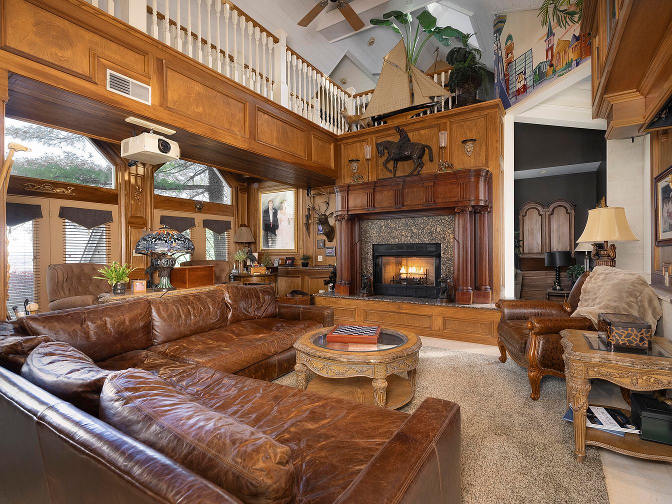 This living room exudes warmth and comfort with its rich wooden paneling and cozy atmosphere. A large, brown leather sectional sofa invites relaxation, complemented by ornate side chairs and an intricately designed coffee table. The fireplace, a focal point, features elegant stonework and a captivating mantle adorned with decorative items, including a horse statue. Above, a projector is mounted for entertainment, while nearby windows are dressed with soft fabric shades. The space is brightened by ample natural light filtering through the windows, enhancing the inviting, rustic charm of the decor, complete with personal touches like family photos.
