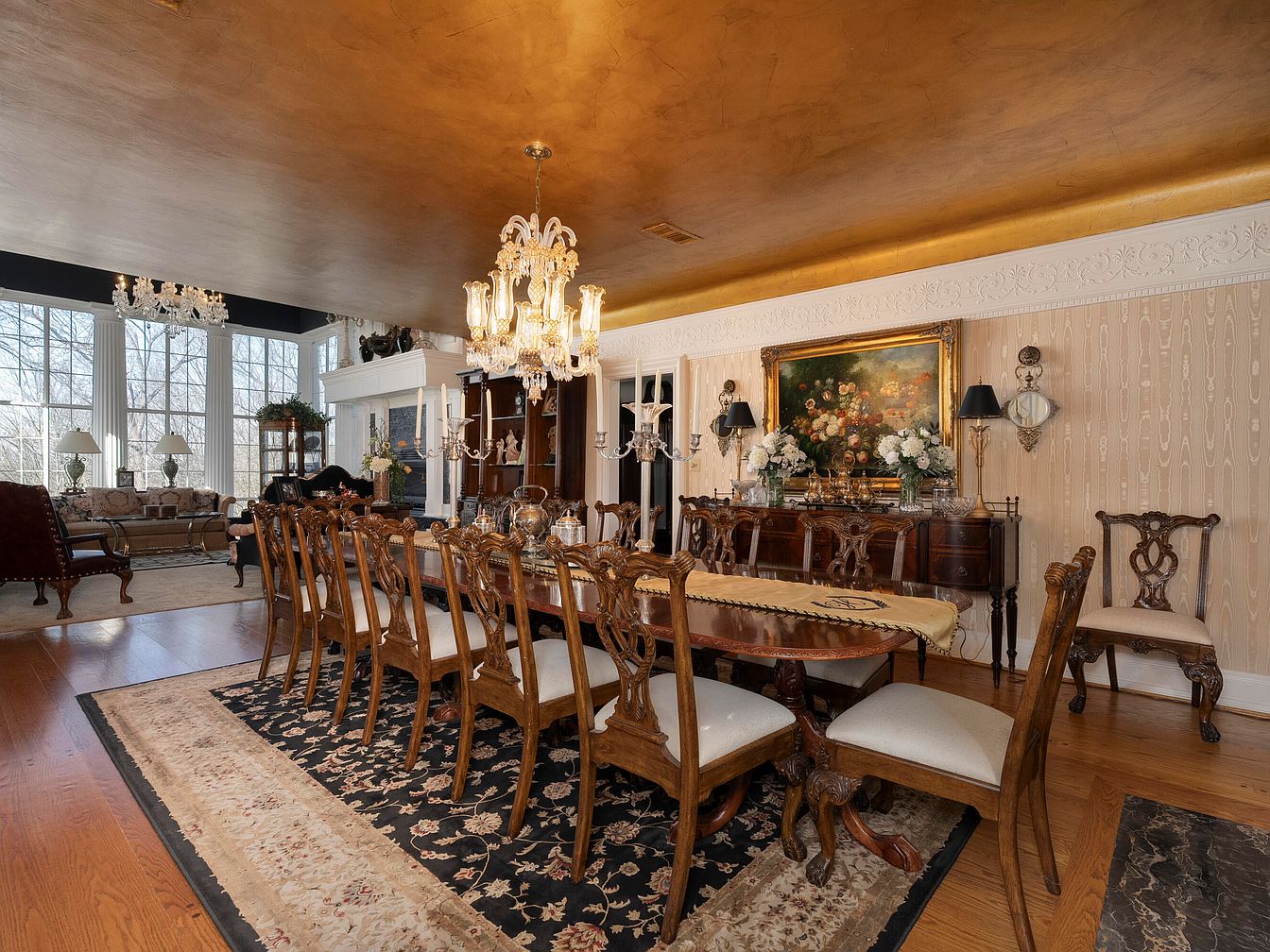 This elegant dining room showcases a long, ornate wooden table surrounded by intricately carved chairs. The table is set with delicate tableware, highlighting a refined hosting atmosphere. A luxurious chandelier hangs from a beautifully textured gold ceiling, illuminating the space with warm light. The walls feature a soft beige hue, adorned with subtle lines and an elegant crown molding. A large painting of flowers adds a vibrant focal point, complemented by stylish sconces flanking it, each housing small, dimmable lamps. Rich, dark wood accents and an area rug with floral patterns enhance the space’s classic aesthetic.