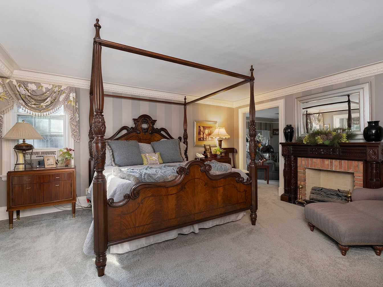 The bedroom showcases a grand four-poster bed made of rich mahogany, featuring intricate carvings. Striped walls in soft gray and white enhance the elegance, while plush carpeting adds warmth. Beside the bed, a vintage wooden nightstand holds a classic lamp, providing a cozy glow. A plush, textured throw drapes across the bed along with inviting pillows, enhancing comfort. A stylish chaise lounge in the corner offers a place for relaxation. The brick fireplace, framed by a decorative mantle, adds character, adorned with elegant vases and greenery. Natural light pours in through the window, illuminating this inviting retreat.