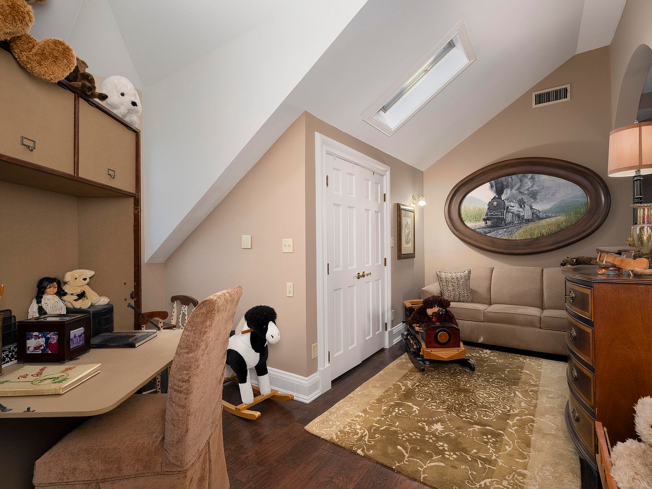 A charming corner dressed in soft earth tones, featuring an inviting beige sofa. The angled walls create a snug atmosphere, enhanced by a plush area rug displaying intricate patterns. A small desk, accented with playful stuffed animals, occupies one side, while a classic rocking horse adds a nostalgic touch. Soft lighting from nearby sconces illuminates a beautiful framed painting of a steam train, adding character. The room’s layout maximizes space efficiently; a white door leads to the rest of the home. The mix of vintage details and airy feel gives this nook a warm, welcoming vibe.