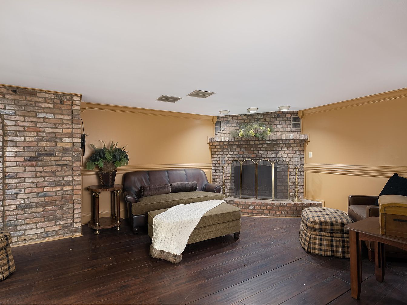 This cozy living room features a warm, earth-toned color palette, highlighted by soft beige walls and a standout brick fireplace. The fireplace serves as a focal point, adorned with a floral arrangement above the mantel. A plush brown leather sofa and a coordinating olive green ottoman invite relaxation, complemented by a knitted throw that adds texture. A plaid accent stool introduces a classic touch, while dark wood flooring enhances the rustic ambiance. Decorative elements include a small side table with intricate detailing and a potted plant, bringing a hint of greenery to the inviting and comfortable space.