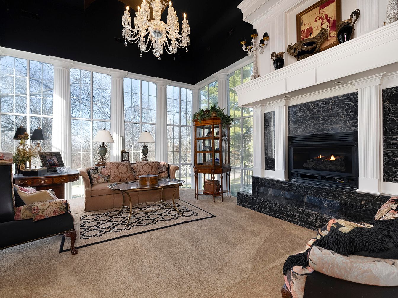 This elegant living room features large windows allowing natural light to flood the space, framed by tall white columns. The color palette mixes soft beiges with rich black, seen in the plush seating and thick area rug adorned with intricate patterns. A striking chandelier hangs from the dark ceiling, adding a touch of opulence. The fireplace, set in a dramatic black marble surround, serves as a focal point, flanked by tasteful decor including lamps and a vintage display cabinet. Soft textiles and floral accents in the furnishings create a cozy yet sophisticated ambiance.