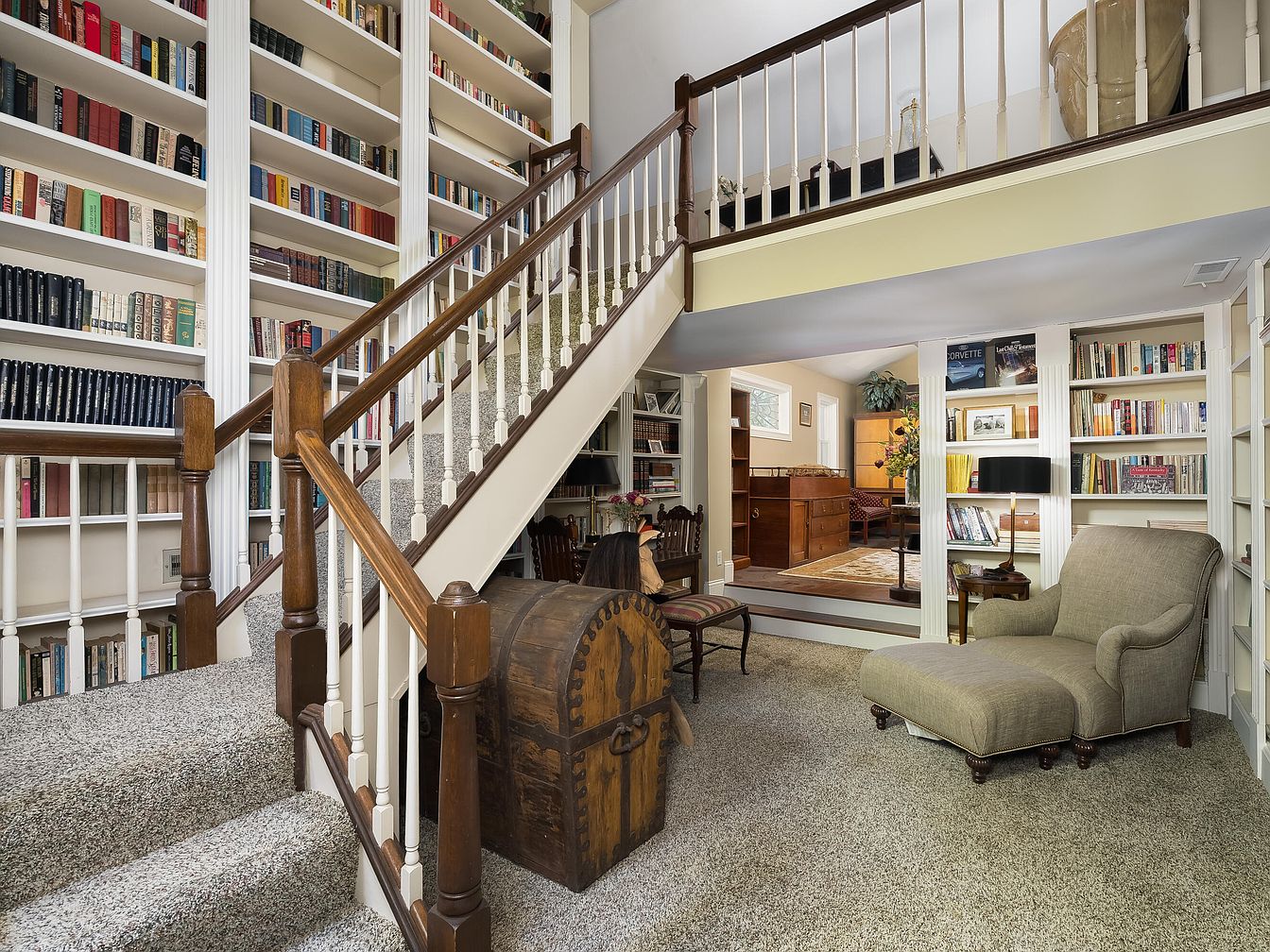 A welcoming library entry features a striking staircase adorned with wooden balusters leading to a second level. Flanking the staircase, built-in bookshelves display an eclectic mix of colorful books, creating a cozy intellectual atmosphere. The carpeted flooring is soft and plush, enhancing comfort. A vintage trunk adds character and storage beneath the stairway. In the lower space, a sophisticated upholstered chaise lounge invites relaxation, complemented by a stylish floor lamp. The room is illuminated by natural light filtering through a nearby window, showcasing warm hues in the decor, creating an inviting and cultured living space.