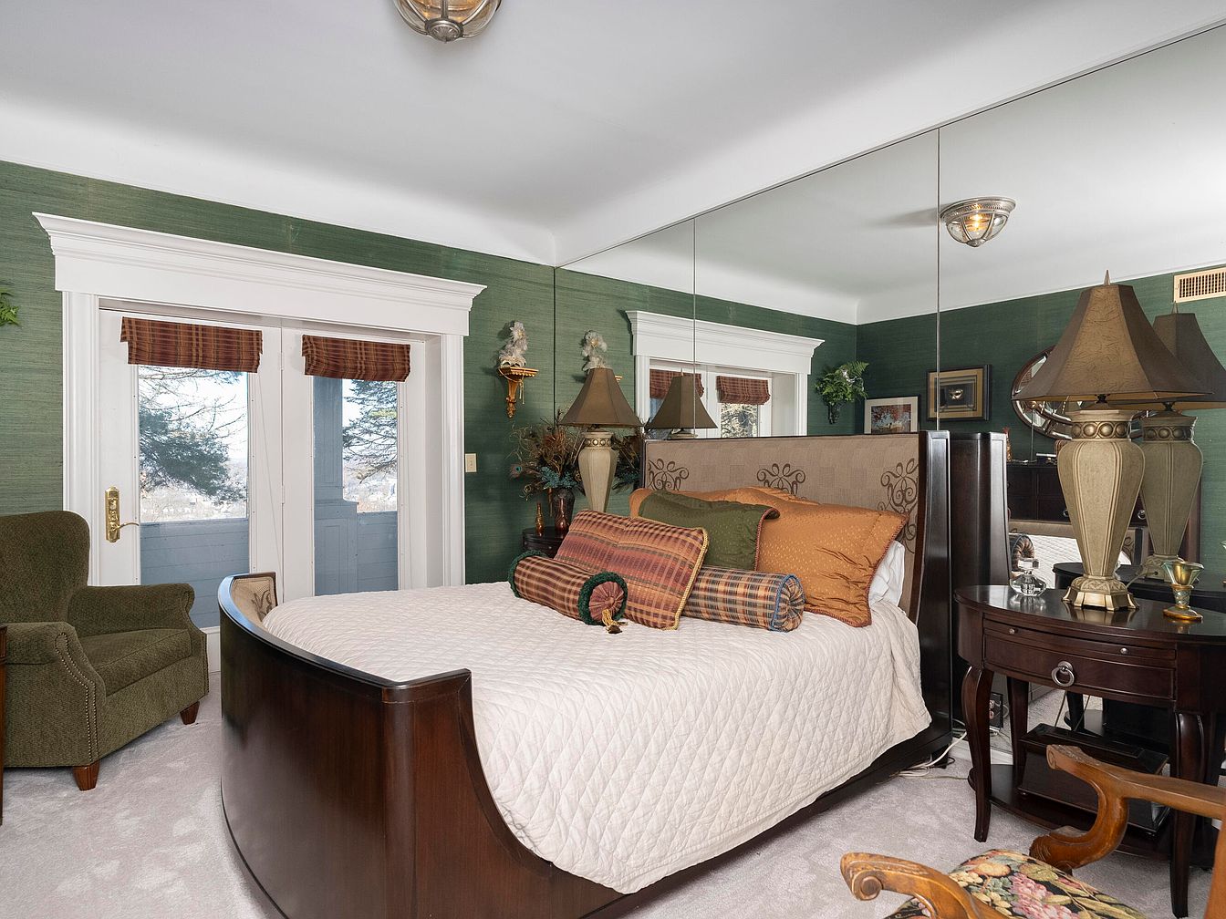 A cozy bedroom featuring rich green walls that add warmth and depth to the space. A large, curved wooden bed with an ornate headboard is adorned with plush bedding in soft creams and earthy browns. Decorative pillows in various patterns enhance comfort and style. To the right, a dark wood nightstand with a vintage lamp complements the furnishings. A comfortable green armchair sits adjacent to the bed, inviting relaxation. Mirrored panels on the wall expand the sense of light and space, while double doors open to a balcony, showcasing the serene outdoor view.